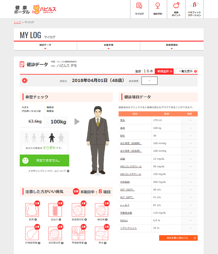 そのためのアプローチとして、健診データの「見える化」を進めています。当社の提供する健康ポータルサイトでは、個人の健診結果からリスク予測まで、個人の医療情報のすべてを管理していますが、たとえばBMIの数値をただ表示するだけでなく、自分の仮の姿として表示されるアバターが太っていく、など、ビジュアル面から健康リスクを実感していただけるような工夫をしています。ほかにもリスク年齢、健康余命などを見せながら、所見のある部分を赤色で表示し、放置しているとどういったリスクがあるのか、どのように生活習慣を改善すればいいかといった情報をお届けしています。