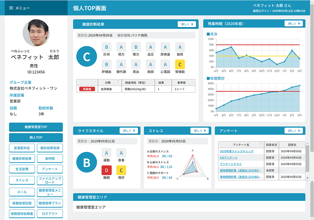そこで2020年6月11日、デジタル技術とデータ活用により業務改革、組織改革につなげるDX(デジタルトランスフォーメーション)の考えに基づいた「ベネワン・プラットフォーム(Bene ONE PLATFORM)」をリリースしました。これにより、当社が提供するサービスで得られたデータを一元管理して可視化、分析することが可能になり、「この人は高血圧だから、今月はこれ以上残業させないほうがいい」といったこともすぐにわかるようになりました。ベネワン・プラットフォームは、ベネフィット・ステーション、あるいはヘルスケアサービスにご契約いただいている企業さまに無償オプションとして提供しています。これまで人事や総務の部門はIT化が遅れていると言われがちでしたが、これにより「人事のDX化」が進むのではないかと思います。