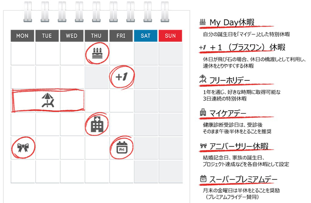当社にはオリジナル有給休暇制度として、健康診断の受診日の午後を半休にするマイケアデー、結婚記念日や自分が決めた記念日に休暇を取れるアニバーサリー休暇などがあります。これらの休暇は、今ある有給休暇に追加する形で付与するものではなく、休暇に呼び名を付けているだけです。その目的は有給休暇を取りやすい雰囲気づくりです。従来は有給休暇を取りたくても取りづらいという声もあったことから、会社から「有給休暇を取っていいんだよ」というメッセージを送る意味で命名しました。