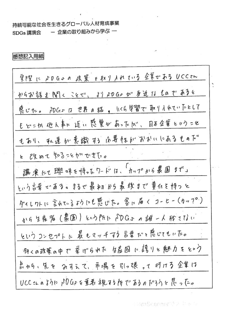 また最近ではオンラインを活用したセミナーにも力を入れており、受講した生徒からは「SDGsに貢献できるコーヒーってすごい」「昔から『SDGs』的なことに挑戦し続けてきたUCCはかっこいい」と嬉しい感想もいただき、社員のモチベーション向上にもつながっています。