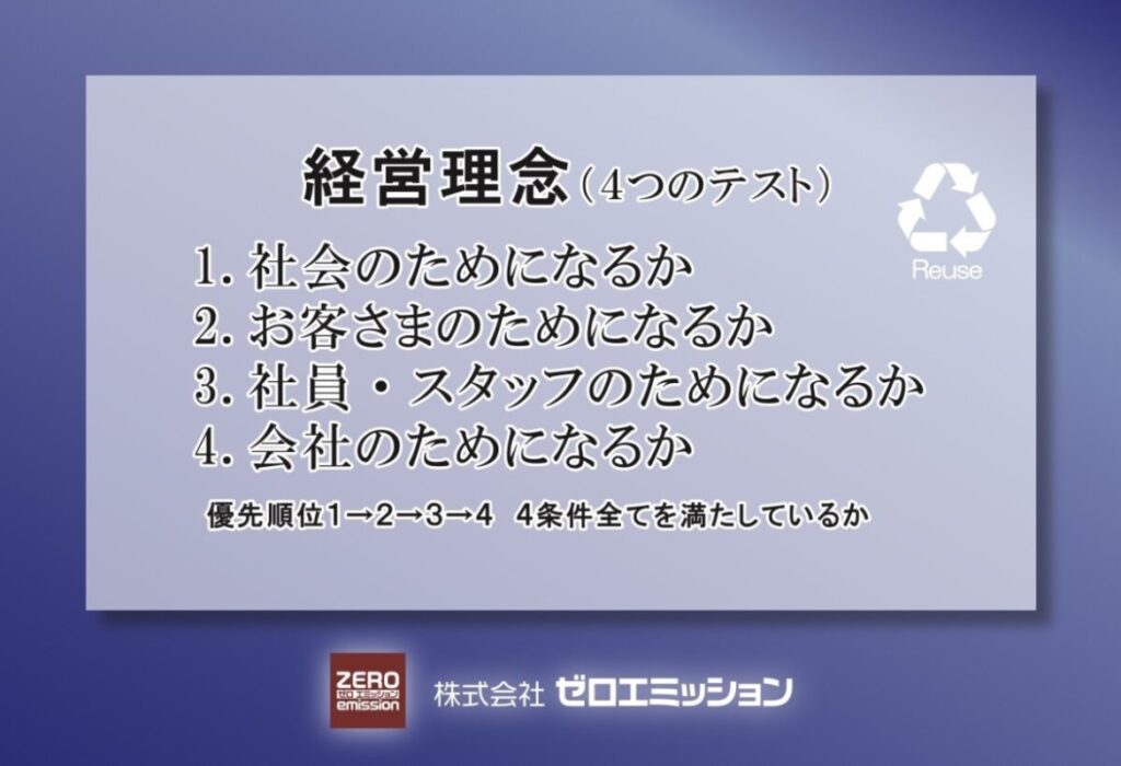 当社が経営理念に掲げているのは「4つのテスト」です。仕事をする時には、「社会のためになるか、お客さまのためになるか、社員・スタッフのためになるか、そして会社のためになるか」という4つの条件を満たすかを常に意識しています。