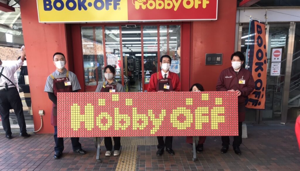 例えば、18年にホビーオフ八王子大和田店で行なった、ペットボトルのキャップを使って文字を完成させる「キャップアート」は、お客さまと一緒に取り組んだ環境活動の一つです。キャップの色を指定したパネルを店頭に設置し、キャップを配置すると『ホビーオフ』の店名ができあがるようにしたところ、多くのお客さまから賛同いただき、予定より早く作品が完成しました。ゴミになるはずだったキャップが、お店の看板に「アップサイクル」したのです。