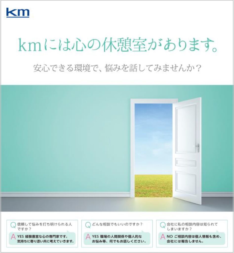 しかし、大学新卒者の採用が100人単位で増えてくると、現場任せでは間に合わなくなってきました。そこで、西川社長のリードにより、2015年に健康保持増進計画「km健康づくりマスタープラン」を策定。疾病などによる長期欠勤者の低減と、メンタル面も含めた健康に起因する事故をゼロにすることを目標に、それまでの受け身の「健康管理」から、自主的に健康への意識を高める「健康経営」へと進化・発展させていきました。