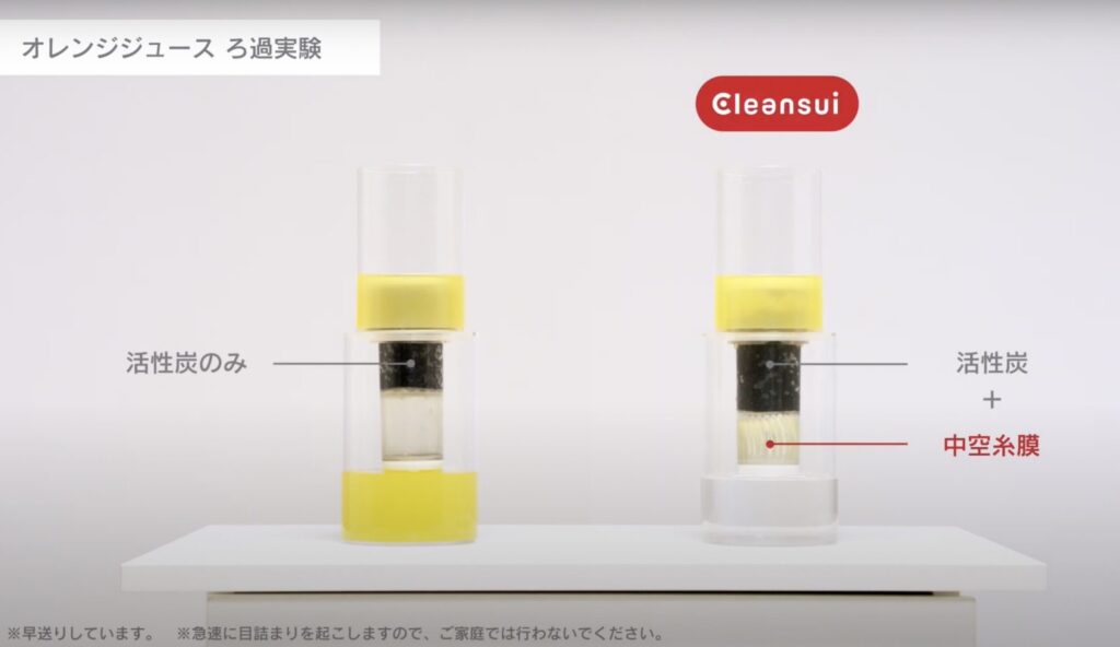 クリンスイの性能を知ってもらうために、私たちはイベントなどでオレンジュースをろ過する実験をすることがあります。これはYouTubeのクリンスイ公式チャンネルでも公開していて、ポット型浄水器の上部からオレンジジュースを注ぐと、クリンスイの浄水器を通って透明になった水が出てきます。これを見るとみなさんも驚かれますが、実際にその水を飲んでみると、ほのかにオレンジ特有の香りと甘みを感じられます。