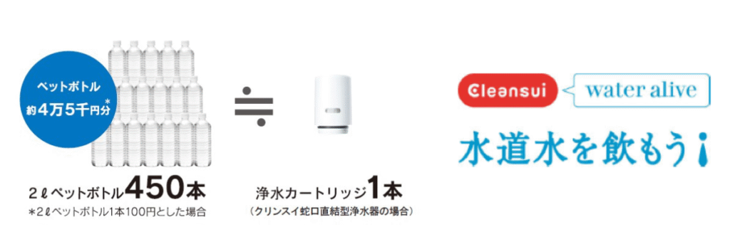 もちろん、水道水も河川や湖沼の水をポンプで汲み上げて、浄水、殺菌し、水道管に送り出す過程でも電力を使うため、環境負荷はゼロではありません。それでも、ペットボトル水に比べれば圧倒的に少なく済みます。ものを原料から作り、流通し、消費されるまでの工程での温室効果ガス排出量を計算するLCA(ライフサイクル環境評価)の計算によると、クリンスイ浄水器に置き換えれば、温室効果ガスは99.6%の削減効果があると言います。(東京都市大学環境学部 伊坪徳宏教授 共同研究より)