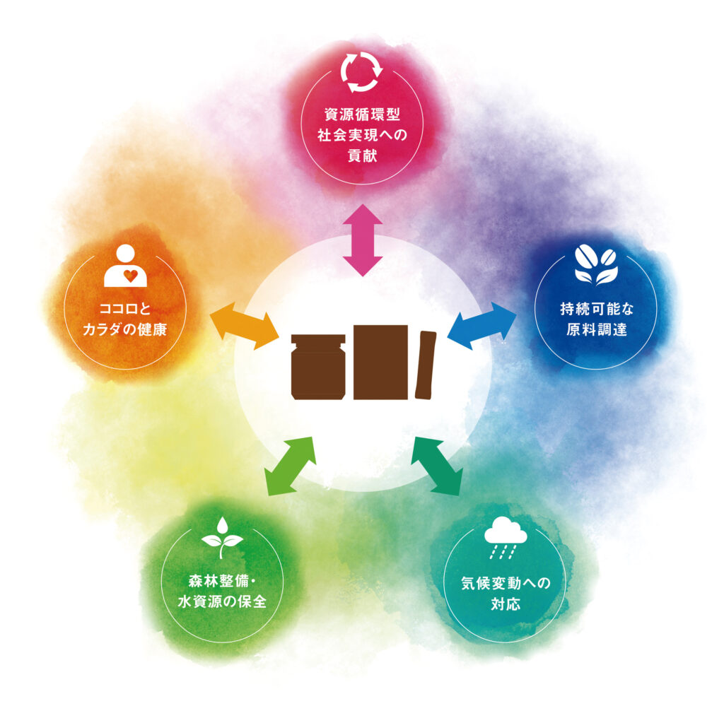 2030年までに「環境負荷50%削減(2018年度対比)」および「10億人の健康寿命を延伸」。これが、当社が所属する味の素グループが掲げている目標です。その目標を実現するために、「資源循環型社会実現への貢献」「ココロとカラダの健康」「森林整備・水資源の保全」「持続可能な原料調達」「気候変動への対応」という5つの重要課題を定めています。