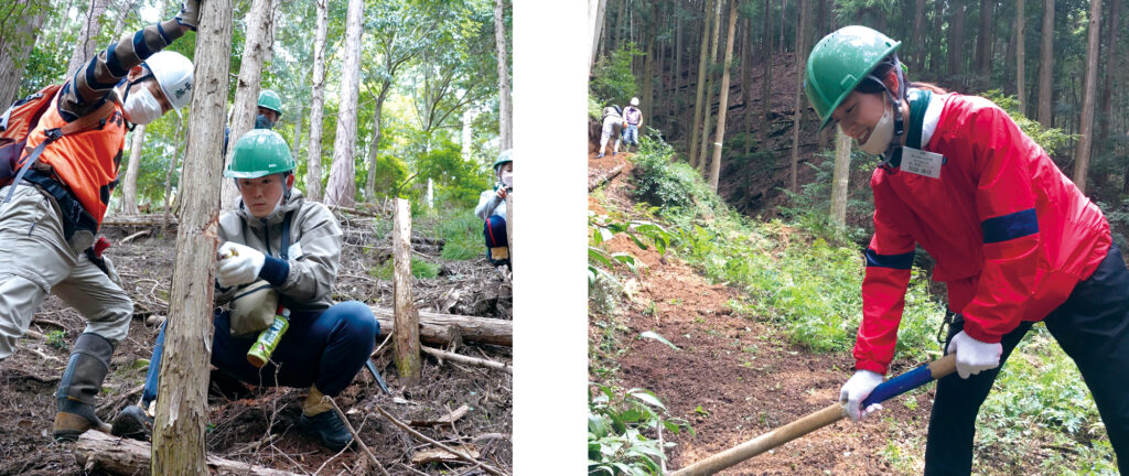 そして、この活動は新入社員や若手研修の一環としても活用しています。仲間と協力して体を動かしながら行う森林整備は、普段の研修では体験することのできない貴重な機会となっています。