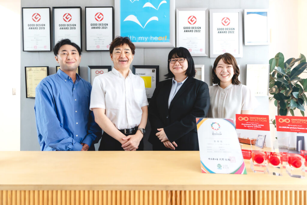 デザイン性の高いアルミ製額縁や、スポーツ関連の立体的なコレクションケースで注目を集める額縁専門メーカー、株式会社アルナ。「額装」の持つ魅力や今後の展望について、雪山大社長と、宮城さん(入社3年目)、塩島さん(3年目)、佐竹さん(4年目)、上山さん(32年目)の社員4人にお話しいただきました。