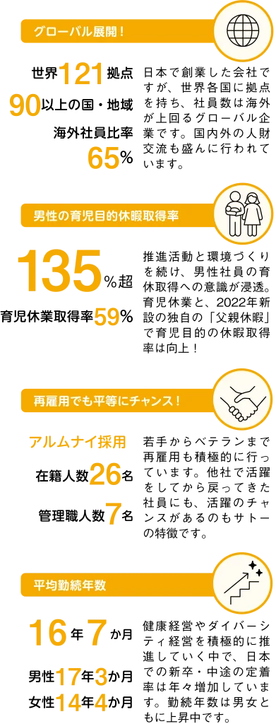 1940年に創業以来「あくなき創造」を社是として、変化する時代や社会のニーズに合わせ、お客様の課題解決のために工夫を重ねてきました。現在は国内46拠点、海外75拠点と、サトーの開発力から生まれた商品は、日本のみならず世界へも展開しています。2011年に「ダイバーシティ宣言」を発表。社員一人ひとりの個性を尊重し、働きやすい職場環境の整備に注力しています。世界中の顧客ニーズに応えながら、時代の変化に合わせ、持続可能な企業であり続けます。