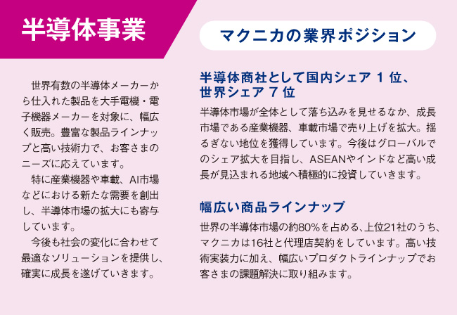 マクニカの強みは、半導体やサイバーセキュリティなどの最先端技術を社会に実装する力です。現場のデータをベースにしたソリューションを提案し、実現することにこだわりがあります。半導体事業を柱としつつ、近年は、社会課題や環境問題への取り組みも進めています。