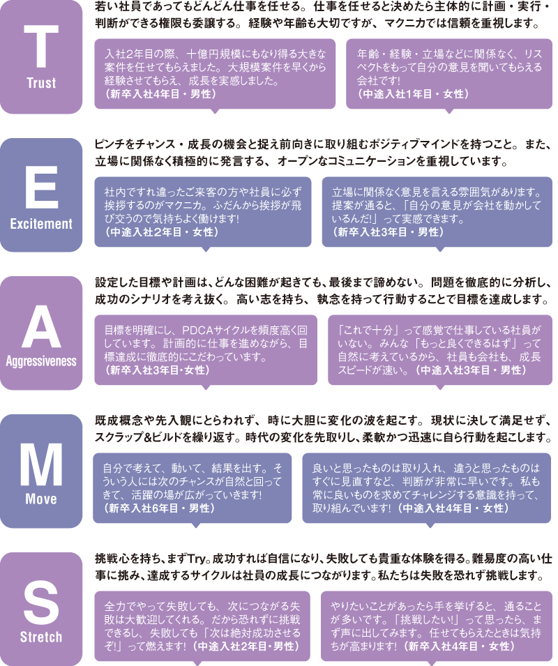 こうした事業の発展を支えているのが、社員たちです。当社には創業以来の精神が、受け継がれるコアバリュー「T.E.A.M.S.」に共感する人が集まります。そこで活躍するのは好奇心を忘れず、柔軟に考え、自ら動き、情熱を持って仕事に取り組める人です。