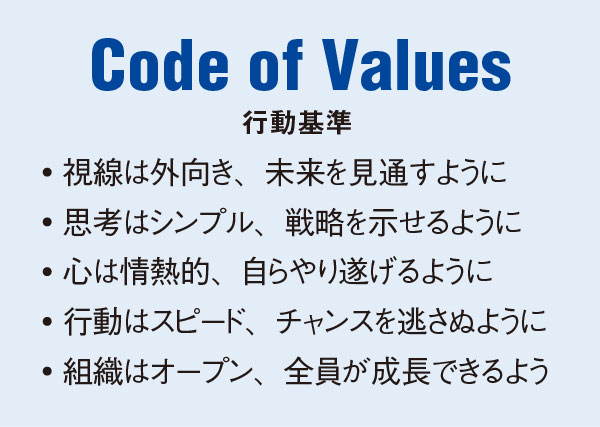 その起点となるのが「フェアな評価」です。役員から新入社員まで共通の行動基準「Code of Values」があり、業績と行動の2軸で評価をし、リーダーの素質があると判断されると、若手でも上のポジションに挑戦できます。