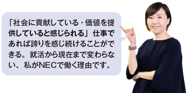NECはいま、新たな成長ステージに上がろうとしています。目の前に広がる「海底から宇宙まで」の壮大な事業領域における価値創出の実感が、働きがいにつながるはずです。「仕事を通して、社会に貢献する」という価値観に共感しNECを選んでほしいと思っています。