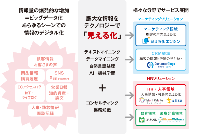 当社は、いわゆるビッグデータと言われる膨大なデータを活用する見える化プラットフォームを提供するために、3つの事業領域を展開しています。1つ目は、顧客の声を生成AIでデータ分析し、顧客の声を収集し、顧客体験を可視化する「見える化エンジン」などを提供するマーケティングソリューション事業。2つ目が、顧客の行動や感情の可視化と顧客管理ができる「カスタマーリングス」を提供するCRMソリューション事業、3つ目が人事課題を解決するタレントマネジメントシステム「タレントパレット」などを提供するHRプラットフォーム事業です。創業以来、累計5500社ほどの企業に導入いただいています。