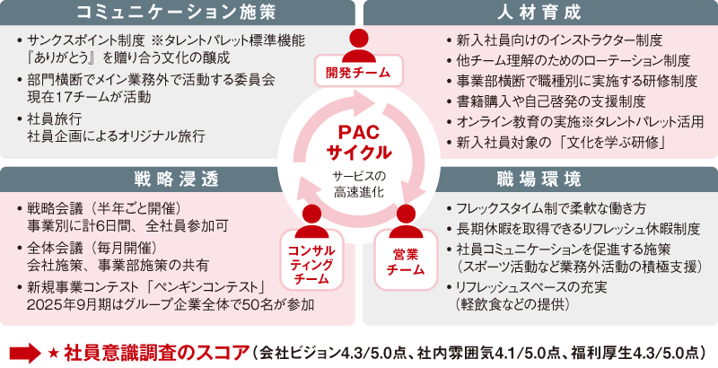行動指針である「PACサイクル」が高速で回るように、コミュニケーション施策や戦略会議の実施、人材育成や職場環境の改善など、人事部ではさまざまな取り組みをおこなっています。年に1回、営業、開発、コンサルタント、コーポレートなどの各部門から「つきぬける感動」と「広がる可能性」を体現している社員の数名が選出され、「PAC Award」として表彰しています。
