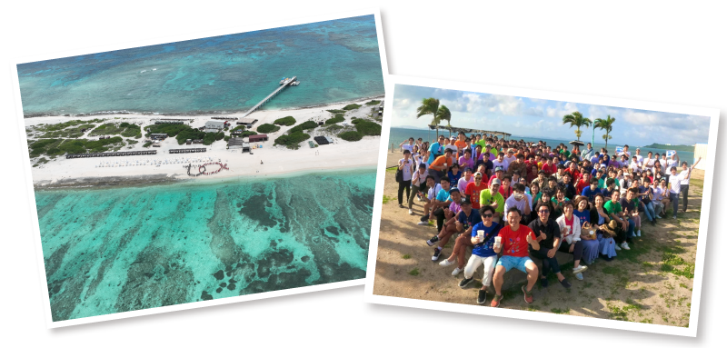 この年は沖縄の離島三昧!無人島を貸し切って、思いっきりアクティビティを楽しみました。無人島ではPACのロゴを人文字で表現!