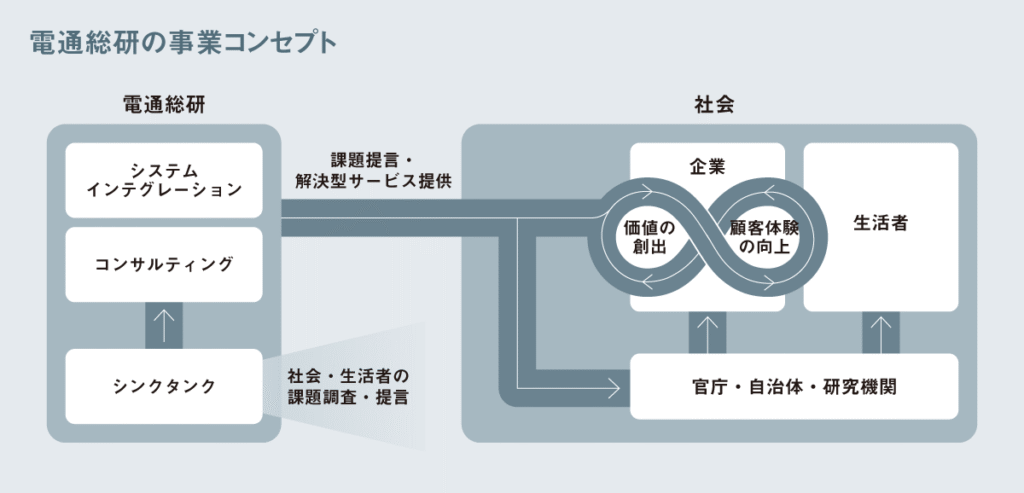 私たちの事業コンセプトは「社会進化実装」です。そのために必要なのが、「シンクタンク」「コンサルティング」「システムインテグレーション」の機能を連携させ、企業活動の根幹である「価値創出」と「顧客体験向上」の両面から最適なソリューションを提供するとともに官庁や自治体、研究機関などに提言することで社会や生活者の進化に寄与することです。