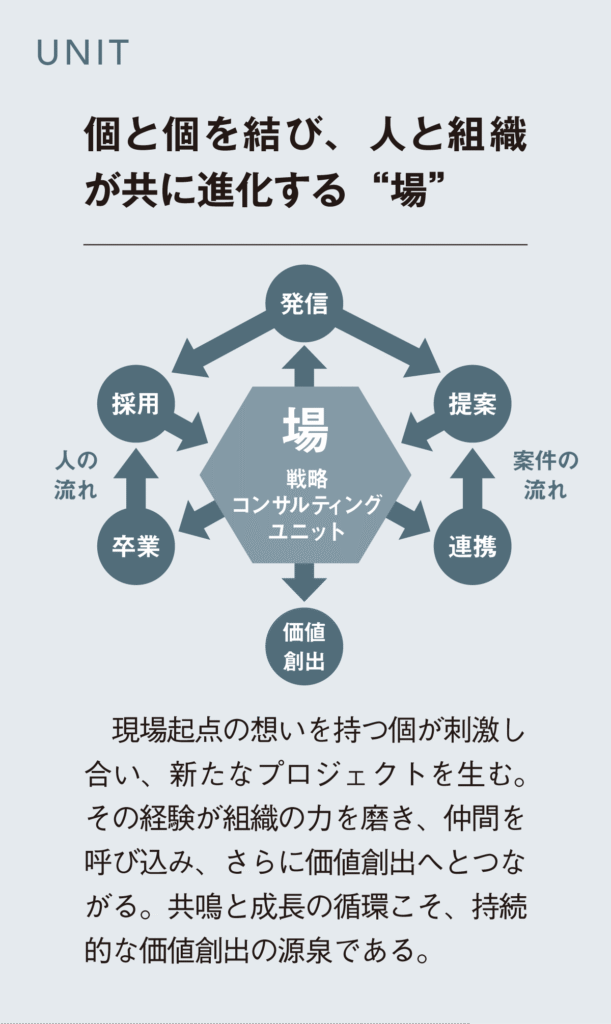 本ユニットが大切にしているのは、戦略の起点を常に現場に置き、一次情報に基づいて課題を捉える姿勢です。現場を知り、実態に触れることで生まれる「この課題を解決したい」という実感のこもった想いこそが、人々を動かし、組織や社会を変えていく原動力になると考えています。