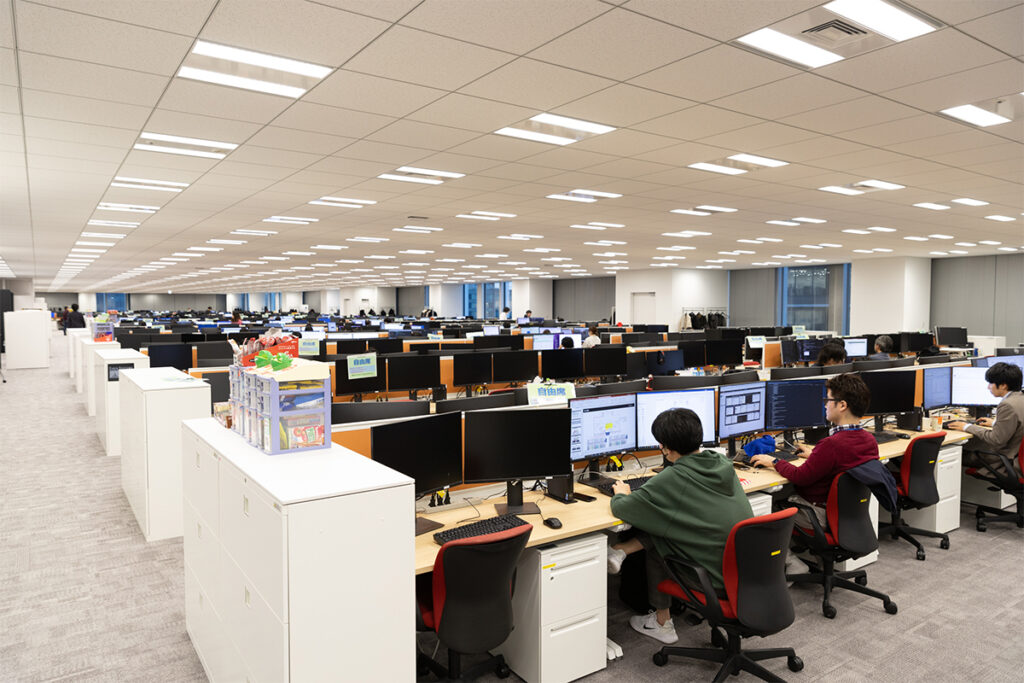 遠くまで見渡せる執務エリア。それぞれデスクにディスプレイを2台ずつ配置しています